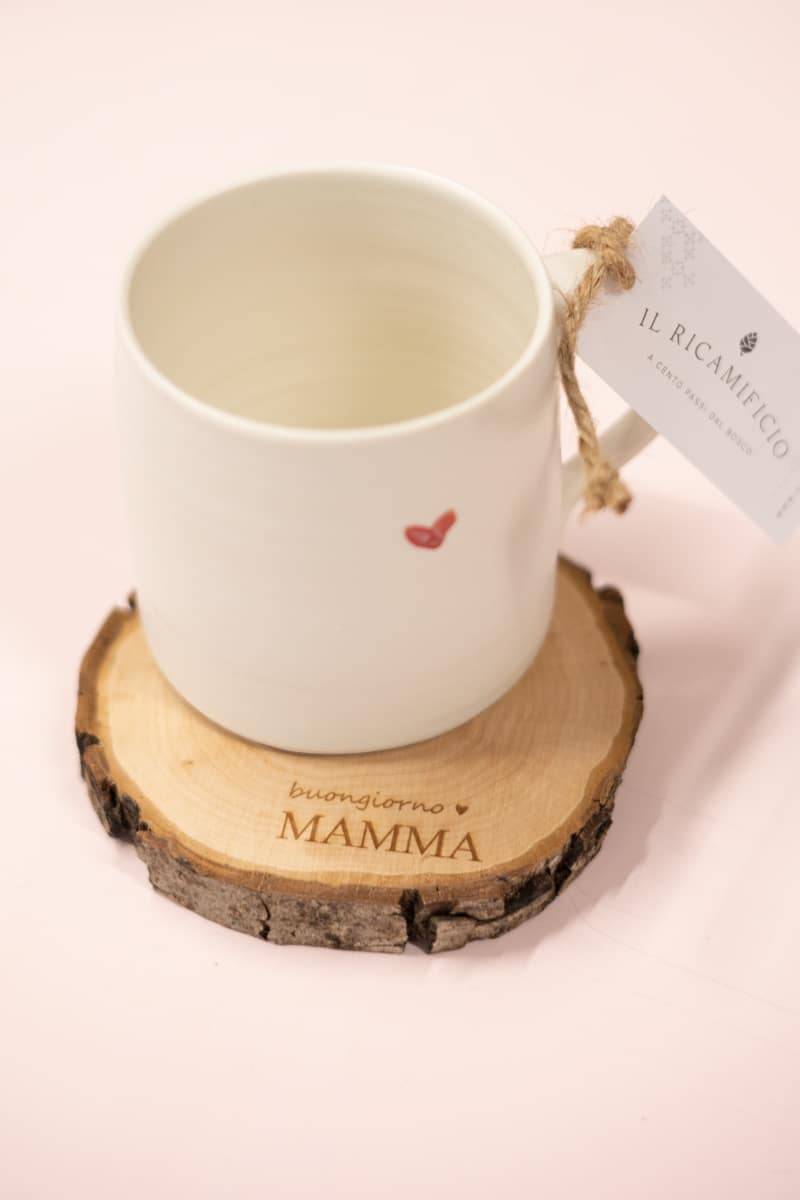 Ad accompagnarla, un elegante sottotazza in legno naturale, inciso al laser con la frase “Buongiorno mamma”: un dettaglio che trasforma una semplice pausa caffè o tè in un momento carico di emozione.