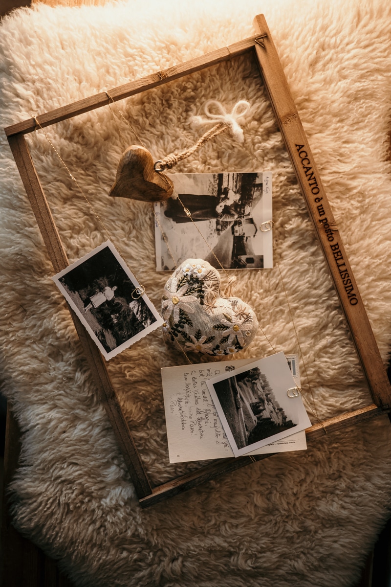 Chi lo regala, è invitato a scegliere le fotografie, appenderle al filo con le graffette dorate, legare i cuori e