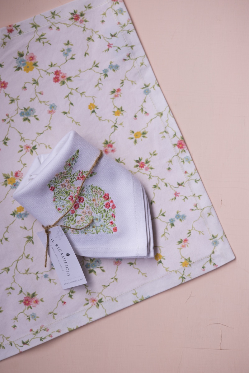 • Tovagliolo in Cotone Ricamato: Il tovagliolo in cotone è impreziosito da un delicato coniglio ricamato. Ogni dettaglio è curato per creare un’atmosfera accogliente e speciale.